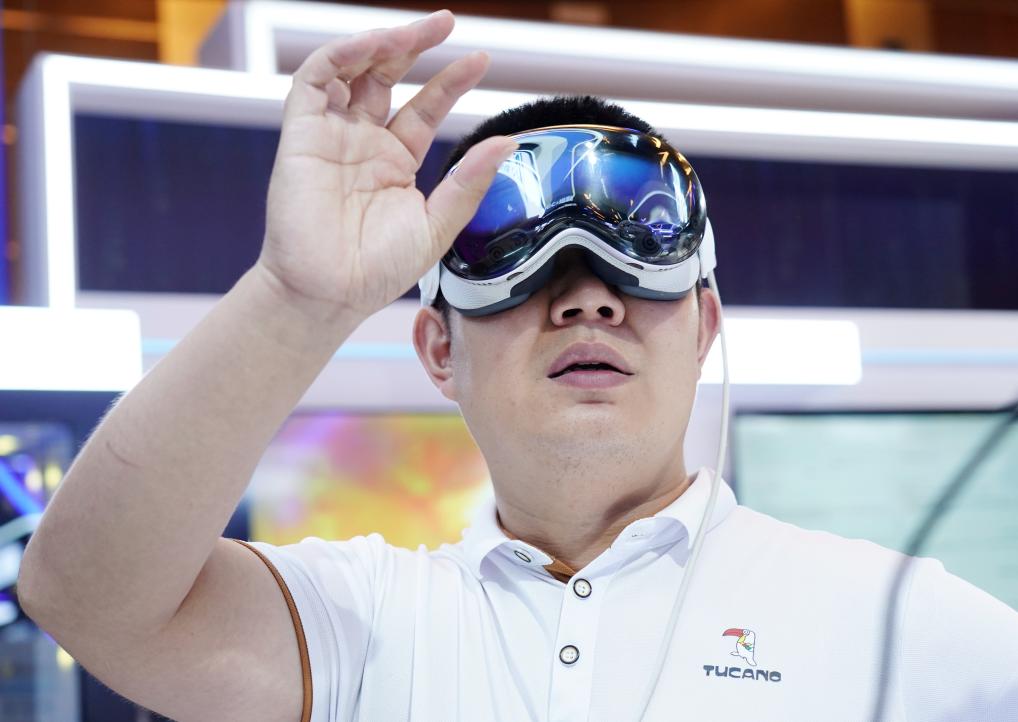 7月2日,參觀者在2025全球數(shù)字經(jīng)濟(jì)大會數(shù)字經(jīng)濟(jì)國際交流合作體驗(yàn)區(qū)體驗(yàn)一款MR混合現(xiàn)實(shí)設(shè)備。新華社記者 張晨霖 攝