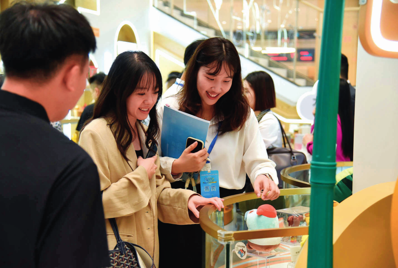 港澳青年在橫琴政務服務中心的“澳品薈”橫琴展示區(qū)瀏覽澳門創(chuàng)意產品(2024年9月23日攝)洪澤華攝/本刊