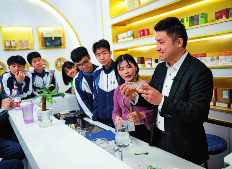 澳門居民黃滋才(右一)在位于橫琴的分子態(tài)(珠海橫琴)中醫(yī)藥健康產業(yè)發(fā)展有限公司的植物(現(xiàn)代中藥)分子博物館內與澳門勞校中學的學生交流(2024年12月11日攝)新華社發(fā)(張金加攝)