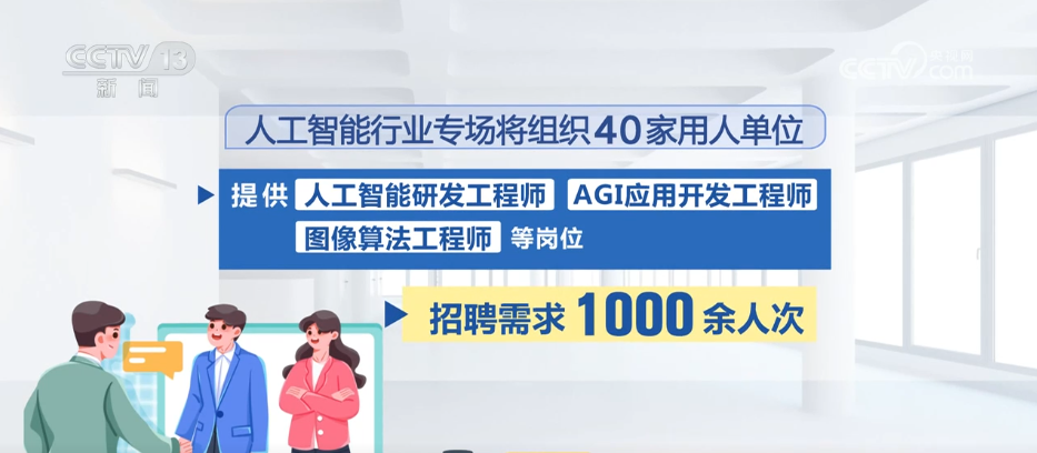 人工智能行業(yè)專場(chǎng)將組織40家用人單位,提供人工智能研發(fā)工程師、AGI應(yīng)用開發(fā)工程師、圖像算法工程師等崗位,招聘需求1000余人次。
