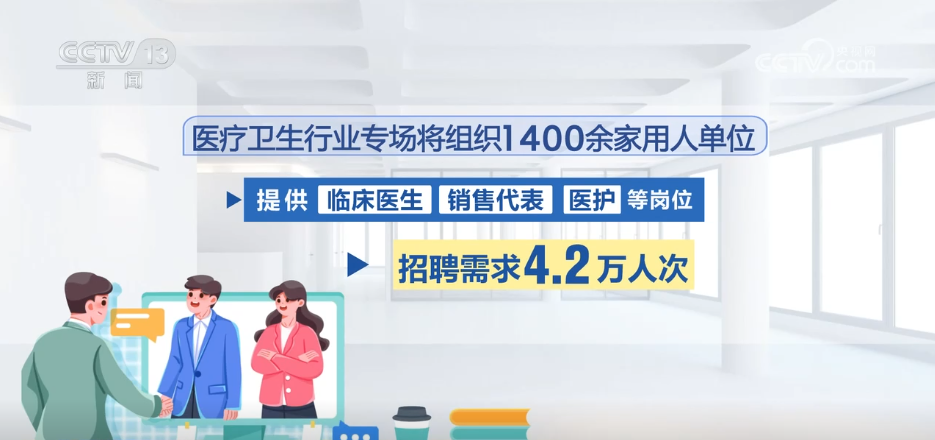 醫(yī)療衛(wèi)生行業(yè)專場(chǎng)將組織1400余家用人單位,提供臨床醫(yī)生、銷售代表、醫(yī)護(hù)等崗位,招聘需求4.2萬(wàn)人次。
