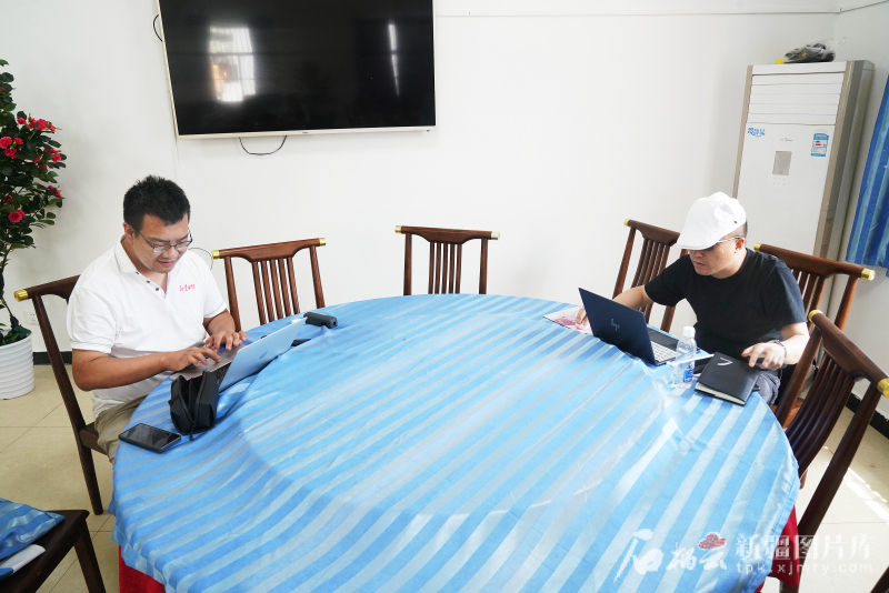 7月1日,在喀什公路事業(yè)發(fā)展中心疏附養(yǎng)護(hù)所蓋孜養(yǎng)護(hù)站,記者馬晉軒(左)和王永飛利用午餐時(shí)間準(zhǔn)備稿件。