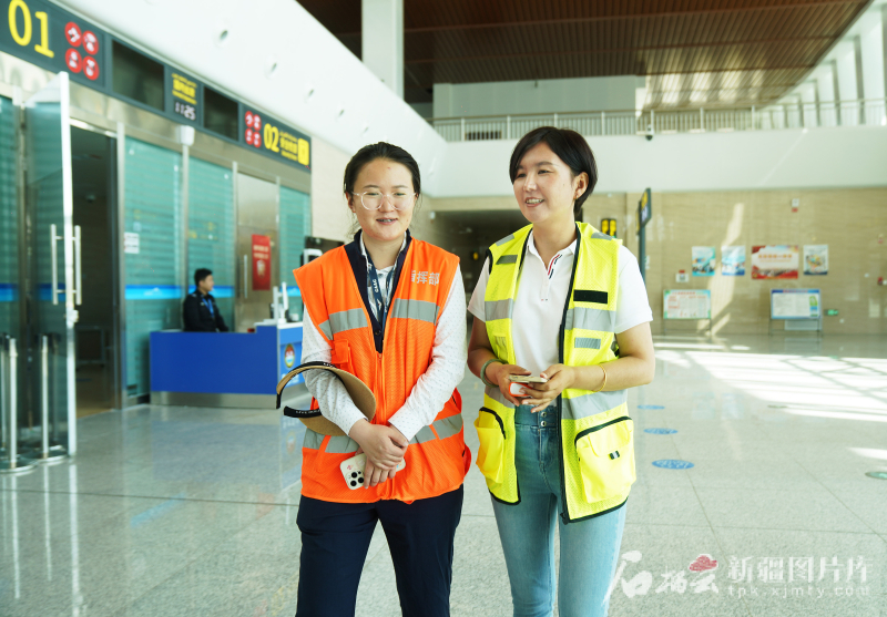 7月4日,記者加孜拉·泥斯拜克(右)在采訪塔什庫(kù)爾干紅其拉甫機(jī)場(chǎng)開通后的變化。