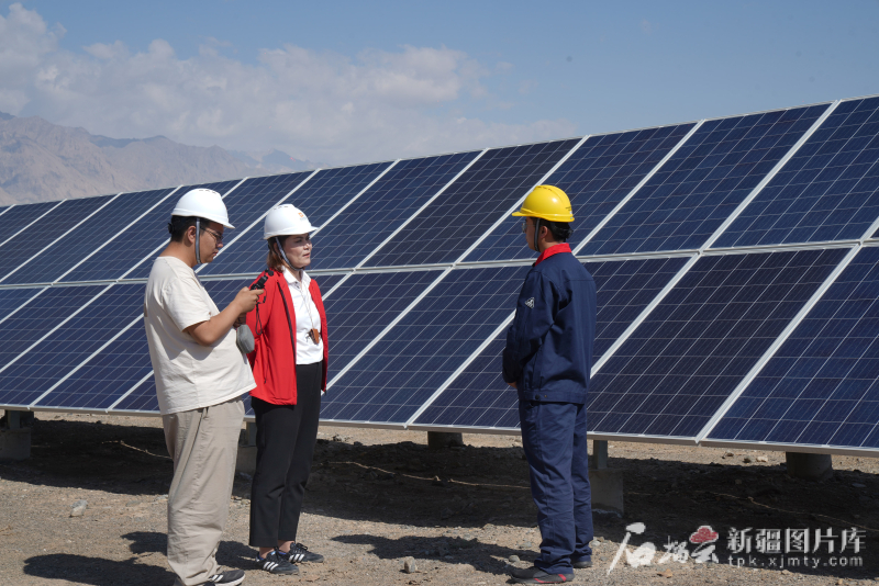 7月3日,在深能福塔光伏電站,記者拍熱扎提·阿不都(中)和馬晉軒(左)了解電站惠及塔什庫(kù)爾干塔吉克自治縣百姓的故事。