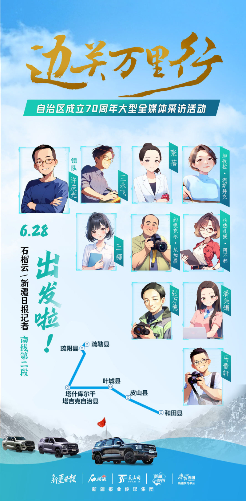 從6月29日開始,“邊關(guān)萬里行——自治區(qū)成立70周年大型全媒體采訪活動(dòng)”南線采訪團(tuán)隊(duì)先后前往喀什市、疏附縣、疏勒縣、伽師縣、塔什庫(kù)爾干塔吉克自治縣、葉城縣等地進(jìn)行采訪。從喀什古城到農(nóng)家小院,從城區(qū)到工業(yè)園區(qū),從邊境派出所到紅其拉甫國(guó)門……記者們一直在路上記錄70年來的發(fā)展變遷。