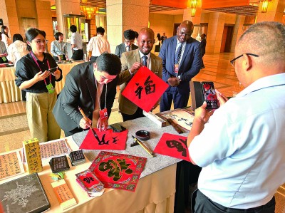 與會(huì)外國嘉賓在會(huì)議間隙體驗(yàn)寫福字。光明日?qǐng)?bào)記者 楊逸夫攝/光明圖片