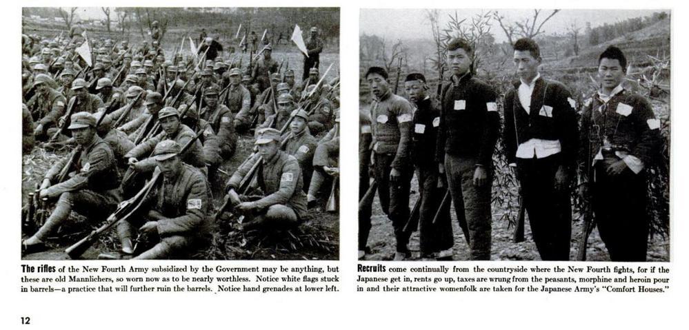 這是1939年7月出版的美國《生活》雜志第12頁影印件局部,展示了史沫特萊拍攝的新四軍的一些畫面。左圖:新四軍的裝備較為簡(jiǎn)陋;右圖:新四軍從作戰(zhàn)的農(nóng)村地區(qū)招募新兵。