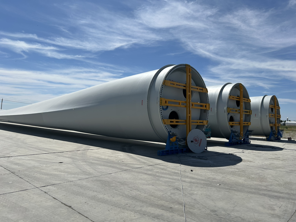 距口岸8公里的塔城重點(diǎn)開發(fā)開放試驗(yàn)區(qū)建設(shè)現(xiàn)場(chǎng),三一風(fēng)電的巨型葉片正等待出口?!拔覀兩a(chǎn)的葉片單只長(zhǎng)度達(dá)112米,重達(dá)41噸,平均每80個(gè)工時(shí)可以生產(chǎn)一只,單只的成本價(jià)在120萬左右。目前,我們公司接收著來自世界各地的訂單” ,塔城風(fēng)電設(shè)備有限公司行政事務(wù)專員阿斯哈爾 阿根三一表示。