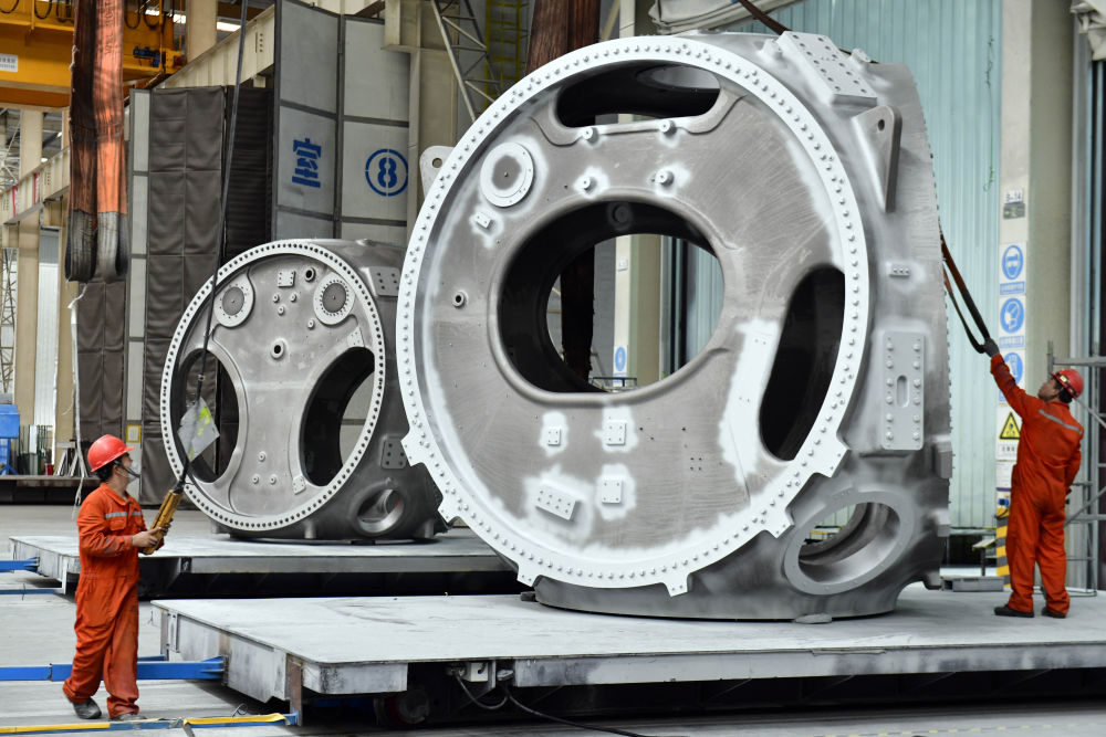 在位于山東省濱州市惠民縣的山東國創(chuàng)精密機(jī)械有限公司,工作人員在對風(fēng)電輪轂進(jìn)行噴涂作業(yè)。新華社記者郭緒雷 攝