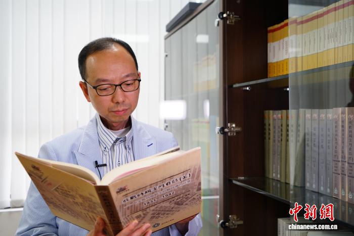 7月24日,澳門理工大學人文及社會科學學院院長、澳門口述歷史協(xié)會會長林發(fā)欽翻閱《抗戰(zhàn)時期澳門日志(上)》?!≈行律缬浾?鄭嘉偉 攝