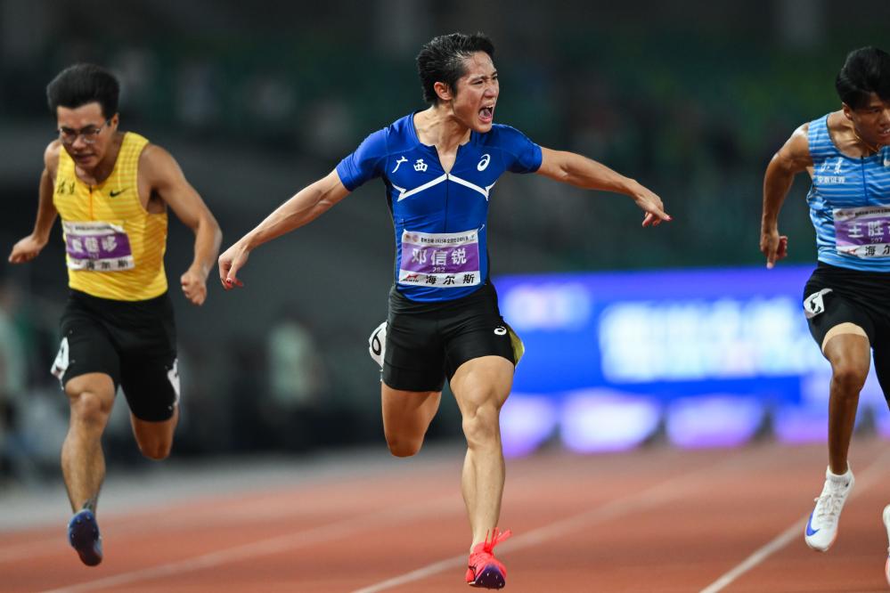 男子100米半決賽也進(jìn)行得異常激烈,名將謝震業(yè)因?yàn)樵谛〗M中排名第四,甚至沒(méi)能闖入決賽。兩小時(shí)之后的決賽中,半決賽排名第一的廣西隊(duì)選手鄧信銳以10秒06的個(gè)人最好成績(jī)奪冠,成為史上第七位突破10秒10的中國(guó)隊(duì)運(yùn)動(dòng)員。