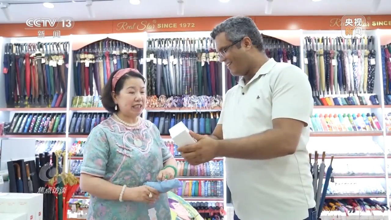 張吉英是義烏小商品市場的一位傘具經(jīng)營戶。今年,她店鋪里一款經(jīng)過創(chuàng)新設計的防曬傘,在國外掀起了一股流行風潮,與國內(nèi)消費者追求防曬傘小巧輕便不同,國外客戶更偏愛大尺寸款式。比如在中東地區(qū),人們喜歡雨傘里面能噴水霧的款式,以追求更好的降溫體驗。