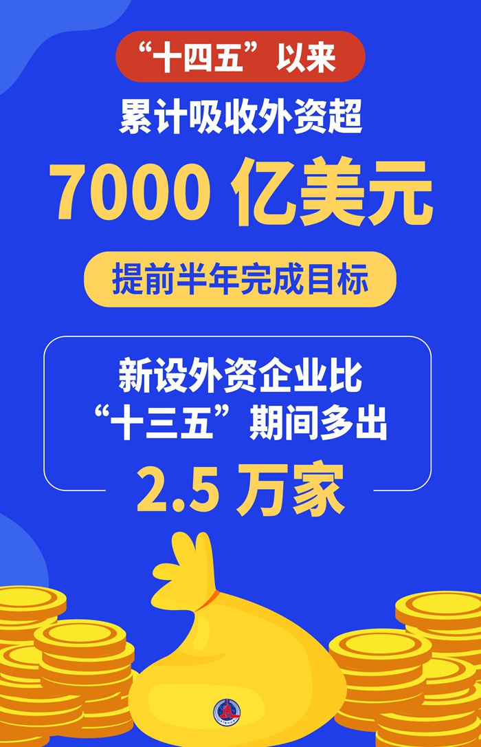 復(fù)雜嚴(yán)峻的國(guó)際經(jīng)貿(mào)環(huán)境下,我國(guó)吸引外資交出亮眼答卷——“十四五”以來(lái),累計(jì)吸收外資超7000億美元,提前半年完成目標(biāo),新設(shè)外資企業(yè)比“十三五”期間多出2.5萬(wàn)家。