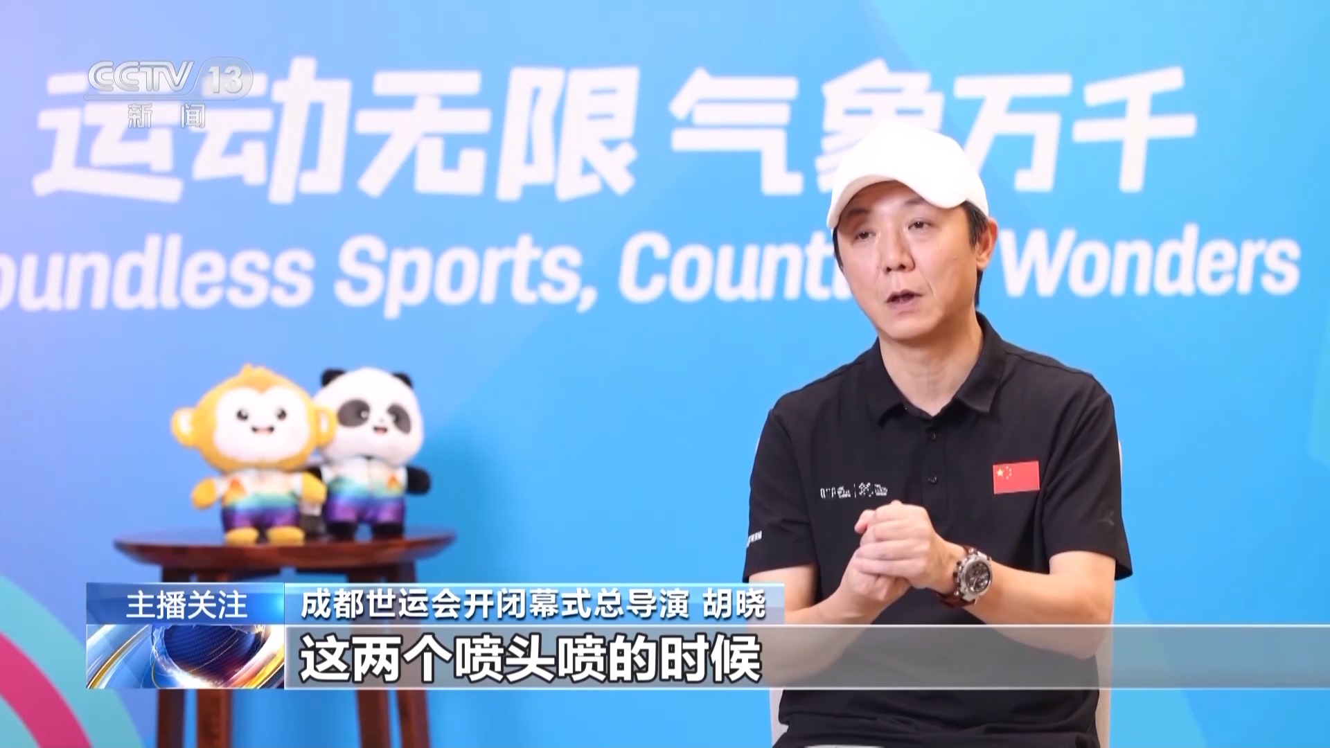 成都世運(yùn)會(huì)開閉幕式總導(dǎo)演 胡曉:乍一看都以為是里面加了個(gè)燃?xì)夤艿?。不是,它真的把天然氣融到水里去了。它是外面一根水管,里面一根氣管,這兩個(gè)噴頭噴的時(shí)候,外面的水管因?yàn)樗膲毫芫鶆?,而且足夠大,可以形成一個(gè)管壁,變成一個(gè)天然氣管道,氣就從里面出來(lái)了,而這個(gè)氣又不能太大,太大了他又把水管壁給沖破了,太小了,又沖不上去,就要找到一個(gè)水與火之間的平衡,然后在最后點(diǎn)著的瞬間,水跟火都能融到一起去燃燒,去綻放,一個(gè)噴起來(lái),一個(gè)燃燒起來(lái)。