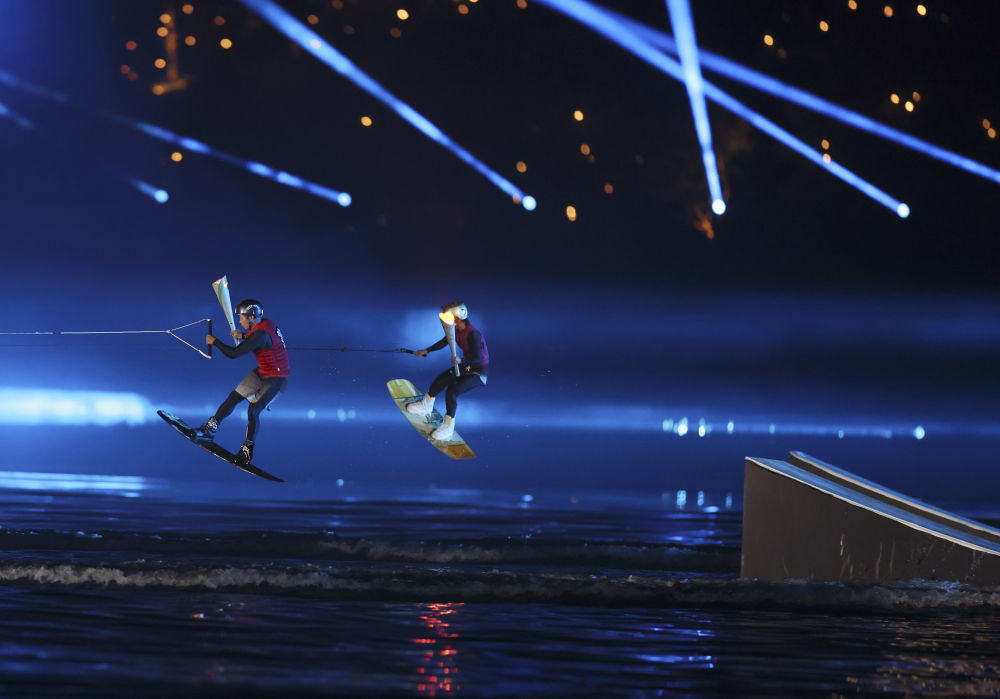 開幕式接近尾聲,中國滑水運(yùn)動員以滑水的方式疾馳于湖上,共同點燃主火炬,水火交相輝映,現(xiàn)場再次沸騰。