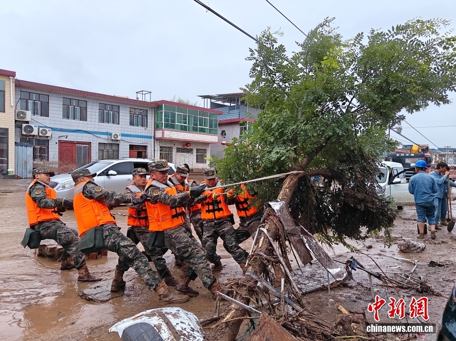 8月8日,武警甘肅總隊機動支隊官兵在甘肅省蘭州市榆中縣興隆山村挪移損毀樹木。劉昆 攝