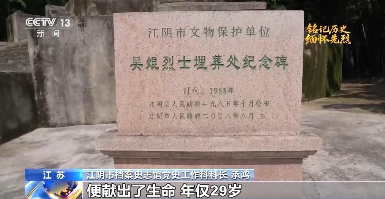 江陰市檔案史志館黨史工作科科長 承鴻:他率領(lǐng)部隊進軍的時候,遭到了國民黨軍隊的冷槍,吳焜頭部中彈,未及留下只言片語,便獻出了生命,年僅29歲。吳焜參加過長征,歷經(jīng)艱難險阻,在作戰(zhàn)和訓練當中,處處以身作則,率先垂范。他指揮作戰(zhàn)時經(jīng)常沖在第一線,非常勇猛,正是依靠這種精神和作風,讓新四軍成為鐵軍。