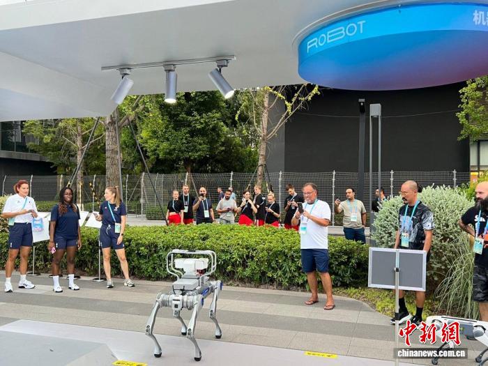 運(yùn)動(dòng)員圍觀成都世運(yùn)村內(nèi)的機(jī)器狗。成都世運(yùn)會(huì)執(zhí)委會(huì)供圖