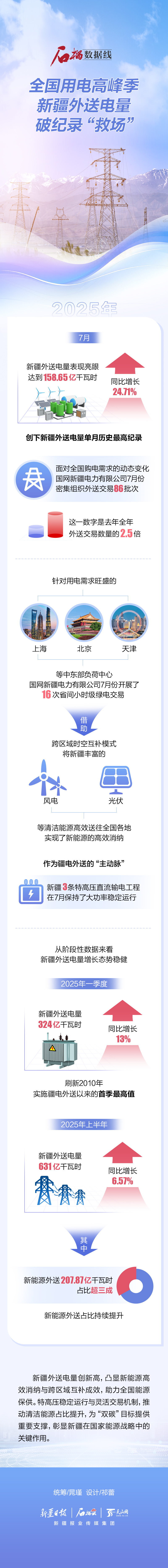 7月新疆外送電量表現(xiàn)亮眼,達到158.65億千瓦時,同比增長24.71%,創(chuàng)下新疆外送電量單月歷史最高紀錄。