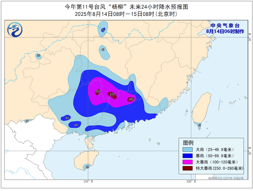 預(yù)計(jì),8月14日08時(shí)至15日08時(shí),廣東大部、廣西大部、福建東南部、江西南部、湖南中南部和西北部、貴州東部等地有大到暴雨,部分地區(qū)大暴雨,其中,廣東北部、廣西東北部、湖南南部、江西西南部等地局地有特大暴雨(250~280毫米)。上述部分地區(qū)伴有短時(shí)強(qiáng)降水(最大小時(shí)降雨量20~50毫米,局地可超過70毫米),局地有雷暴大風(fēng)等強(qiáng)對(duì)流天氣。