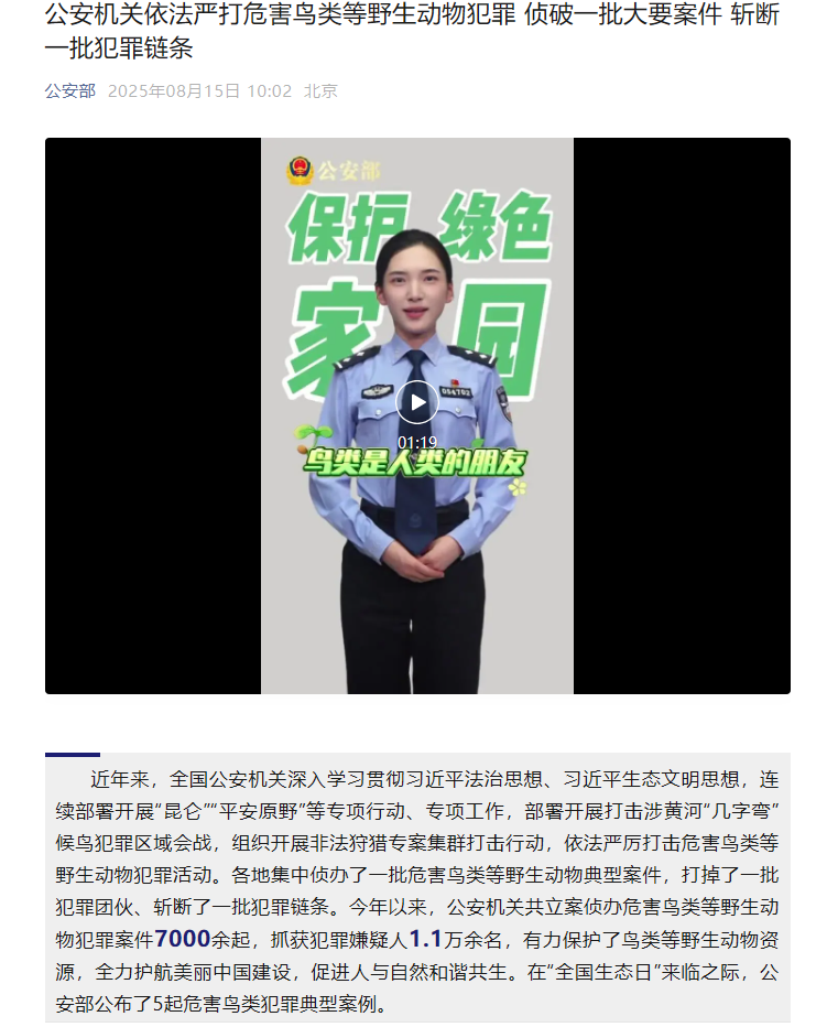 近年來,全國公安機(jī)關(guān)深入學(xué)習(xí)貫徹習(xí)近平法治思想、習(xí)近平生態(tài)文明思想,連續(xù)部署開展“昆侖”“平安原野”等專項(xiàng)行動(dòng)、專項(xiàng)工作,部署開展打擊涉黃河“幾字彎”候鳥犯罪區(qū)域會戰(zhàn),組織開展非法狩獵專案集群打擊行動(dòng),依法嚴(yán)厲打擊危害鳥類等野生動(dòng)物犯罪活動(dòng)。各地集中偵辦了一批危害鳥類等野生動(dòng)物典型案件,打掉了一批犯罪團(tuán)伙、斬?cái)嗔艘慌缸镦湕l。今年以來,公安機(jī)關(guān)共立案偵辦危害鳥類等野生動(dòng)物犯罪案件7000余起,抓獲犯罪嫌疑人1.1萬余名,有力保護(hù)了鳥類等野生動(dòng)物資源,全力護(hù)航美麗中國建設(shè),促進(jìn)人與自然和諧共生。在“全國生態(tài)日”來臨之際,公安部公布了5起危害鳥類犯罪典型案例。