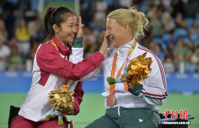 2016年9月14日,里約殘奧會,輪椅擊劍女子個人花劍A級比賽冠軍獲得者中國選手榮靜正與獲得銅牌的匈牙利選手克拉伊尼亞克相互擦拭喜悅的淚水。 薩樂馬什 攝