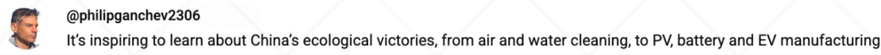 網友@philipganchev2306表示,“從空氣和水凈化到光伏、電池和電動汽車制造,了解中國在生態(tài)領域取得的成就令人鼓舞?!?/p>