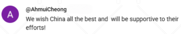 網友@Ahmuicheong祝愿道,“祝愿中國一切順利,支持他們的努力!”