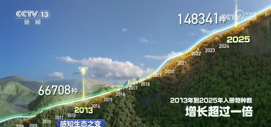 如今,《中國(guó)生物物種名錄》上“入冊(cè)”的生物種數(shù),從2013年的6.7萬(wàn)種增長(zhǎng)到2025年的14.8萬(wàn)種,增長(zhǎng)超過(guò)一倍。近500種野生動(dòng)植物的受威脅等級(jí)出現(xiàn)下降。