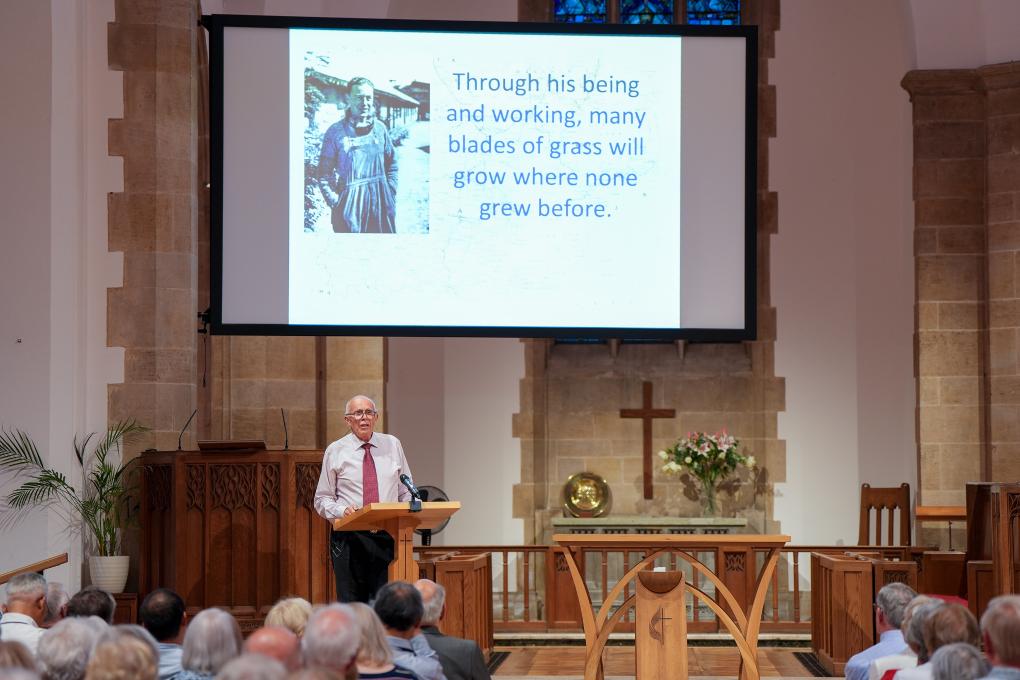 7月22日晚,英國赫特福德郡哈彭登鎮(zhèn),何克逝世80周年紀(jì)念活動(dòng)現(xiàn)場,座無虛席。屏幕上,一幀幀畫面定格下何克在中國的身影與足跡。講臺(tái)上,何克的外甥馬克·艾爾溫·托馬斯深情講述80多年前的往事。