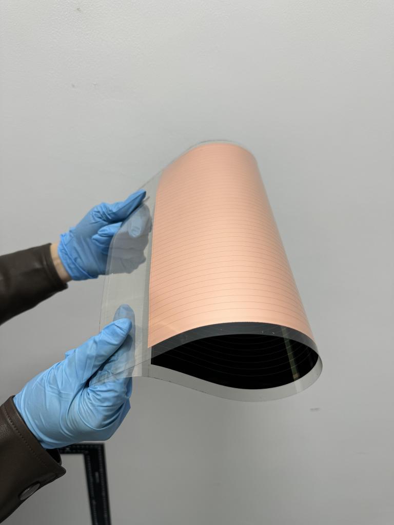 今年,校企聯合團隊成功將原位涂層技術轉移到工業(yè)級狹縫涂布設備上,實現寬帶隙鈣鈦礦薄膜在800多平方厘米的柔性基板上一次成型。