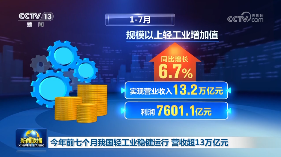 中國輕工業(yè)聯(lián)合會(huì)數(shù)據(jù)顯示,今年前七個(gè)月,在擴(kuò)內(nèi)需、促消費(fèi)政策支持下,我國輕工業(yè)運(yùn)行穩(wěn)健,生產(chǎn)、營收、市場規(guī)模均保持良好態(tài)勢。規(guī)模以上輕工業(yè)增加值同比增長6.7%,實(shí)現(xiàn)營業(yè)收入13.2萬億元、利潤7601.1億元。