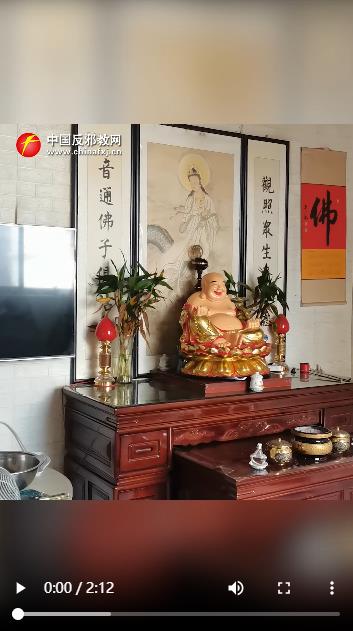 涉案“一貫道”組織某“佛堂”擺放,供奉彌勒佛和濟(jì)公等,彌勒佛后上方擺放有“母燈”,指代“無生老母”