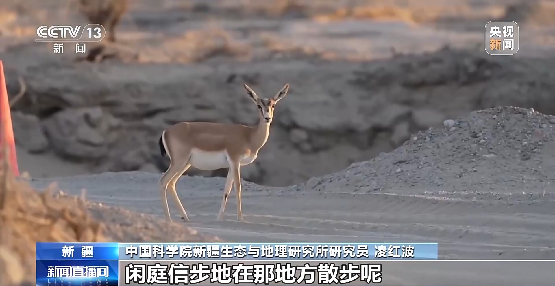 中國科學(xué)院新疆生態(tài)與地理研究所研究員 凌紅波:黃羊不怕人了,閑庭信步地在那兒散步呢。這就是人與自然和諧相處。