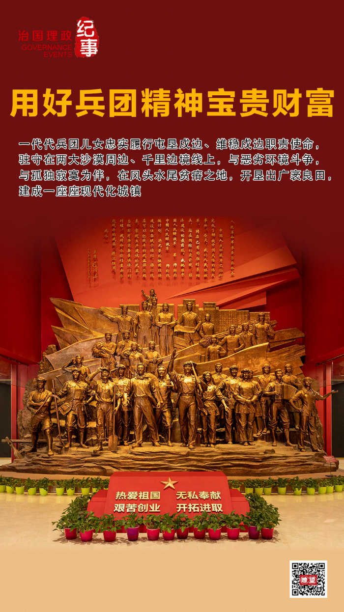 ◇2022年7月,習(xí)近平總書記在新疆考察時(shí)來(lái)到新疆生產(chǎn)建設(shè)兵團(tuán)八師石河子市,參觀新疆兵團(tuán)軍墾博物館。會(huì)見兵團(tuán)老中青三代建設(shè)者代表時(shí),他強(qiáng)調(diào),新疆生產(chǎn)建設(shè)兵團(tuán)為推動(dòng)新疆發(fā)展、增進(jìn)民族團(tuán)結(jié)、維護(hù)社會(huì)穩(wěn)定、鞏固國(guó)家邊防作出了不可磨滅的貢獻(xiàn)。兵團(tuán)人鑄就的熱愛(ài)祖國(guó)、無(wú)私奉獻(xiàn)、艱苦創(chuàng)業(yè)、開拓進(jìn)取的兵團(tuán)精神,是中國(guó)共產(chǎn)黨人精神譜系的重要組成部分,要用好這些寶貴財(cái)富。