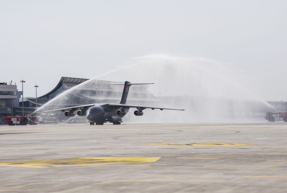 9月12日,第十二批在韓中國人民志愿軍烈士遺骸回國。這是在沈陽桃仙國際機(jī)場,接運烈士遺骸回國的運-20專機(jī)通過水門。新華社記者 潘昱龍 攝