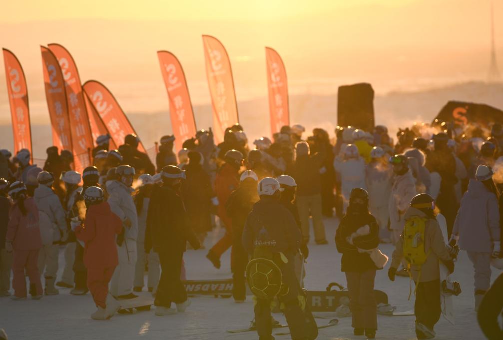 日落時分,阿勒泰市將軍山國際滑雪度假區(qū)的山頂區(qū)域人頭攢動(2025年1月24日攝)。新華社記者 胡虎虎 攝