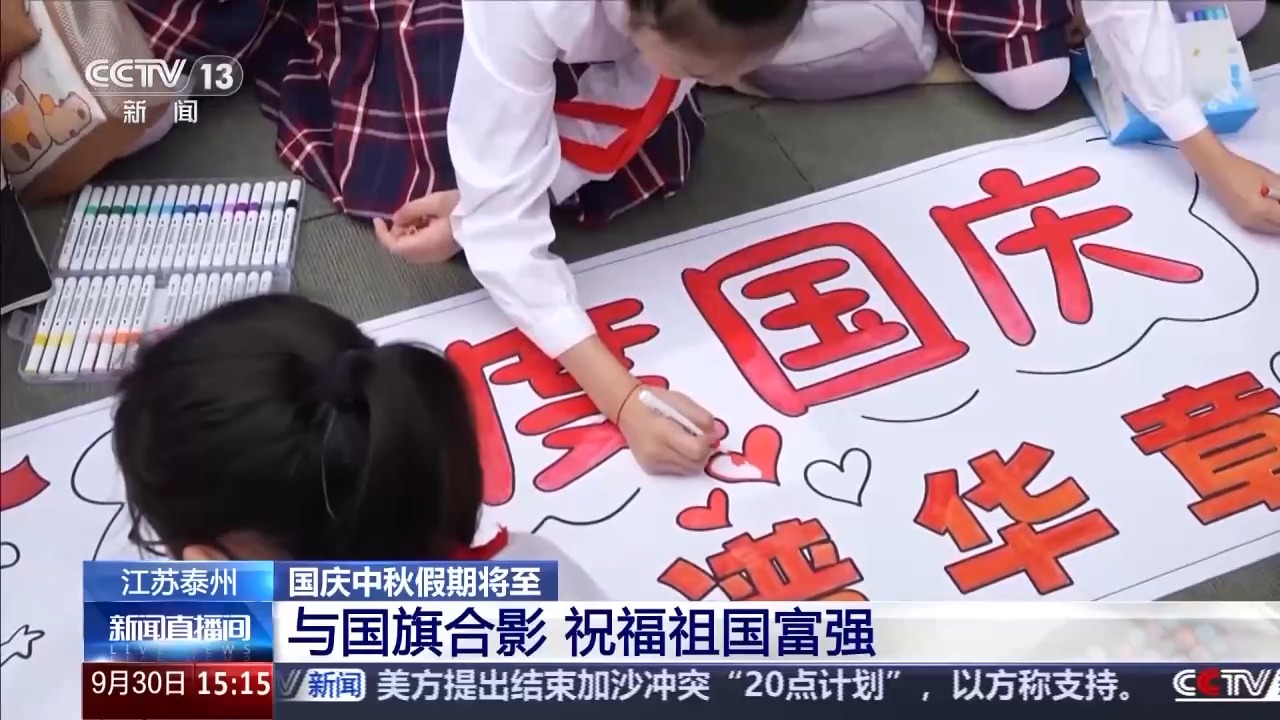 此外,在泰州市海陵區(qū)的泰山公園里,40名小學(xué)生在長(zhǎng)卷上共同作畫,描繪出祖國的壯美山河與輝煌成就,祝福祖國繁榮富強(qiáng)。
