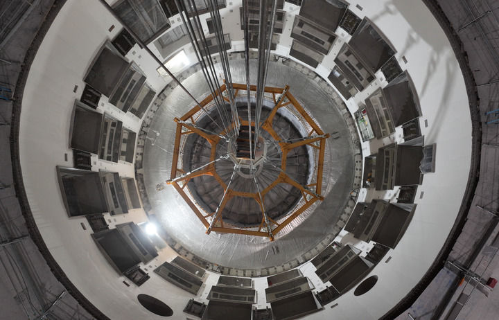 這是2025年10月1日在安徽合肥未來大科學城緊湊型聚變能實驗裝置(BEST)建設現場拍攝的成功落位安裝的杜瓦底座(無人機照片)。新華社記者 周牧 攝