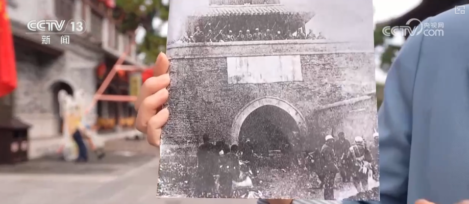 莒國(guó)古城里到處都是喜氣洋洋、熱鬧非凡。這張?zhí)厥獾恼掌【暗鼐褪窃谶@里,這是當(dāng)年莒城解放戰(zhàn)后的情形,戰(zhàn)士們登上了城樓,定格下了這份來(lái)之不易的勝利。