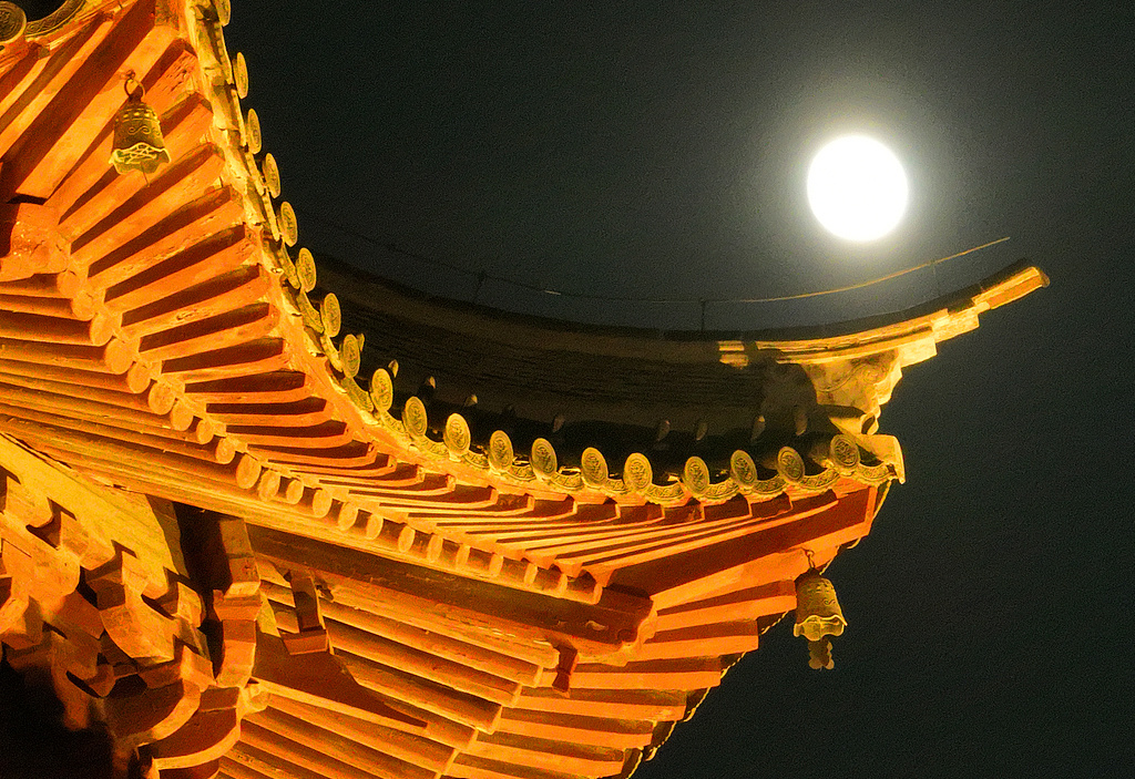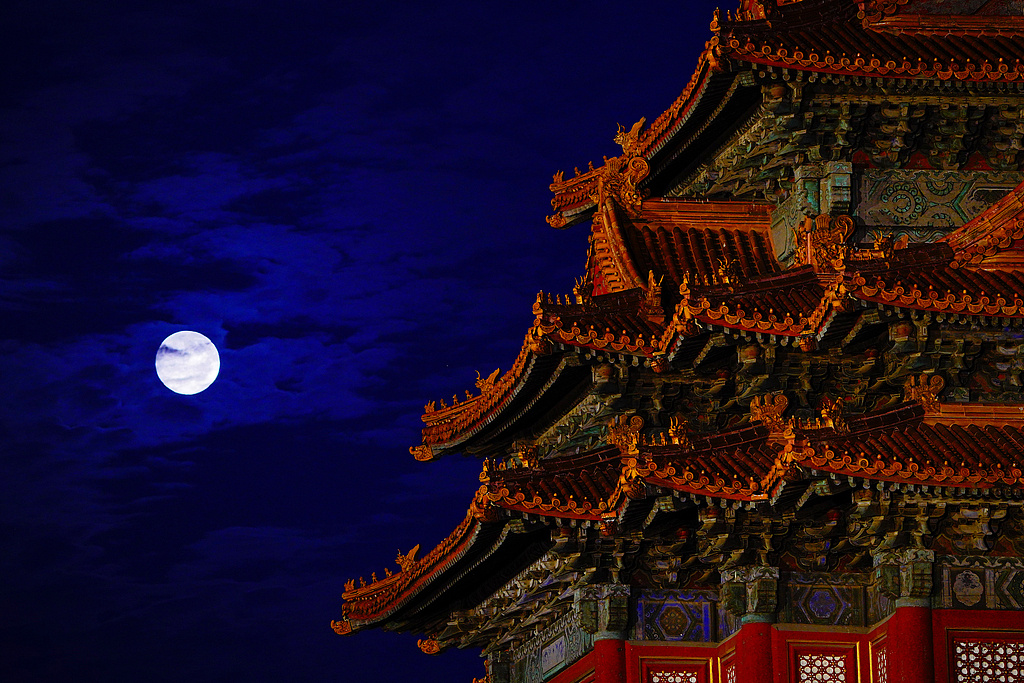 北京,夜幕降臨,一輪圓月現(xiàn)身夜空,偶有彩云相伴。圓月與故宮角樓、角樓脊獸同框,仿佛穿越古今。