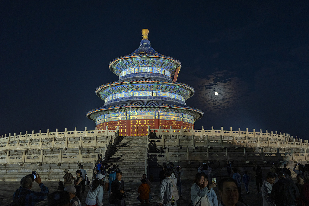 中秋佳節(jié),北京天壇公園祈年殿亮燈,一輪圓月從東方升起,與祈年殿交相輝映。