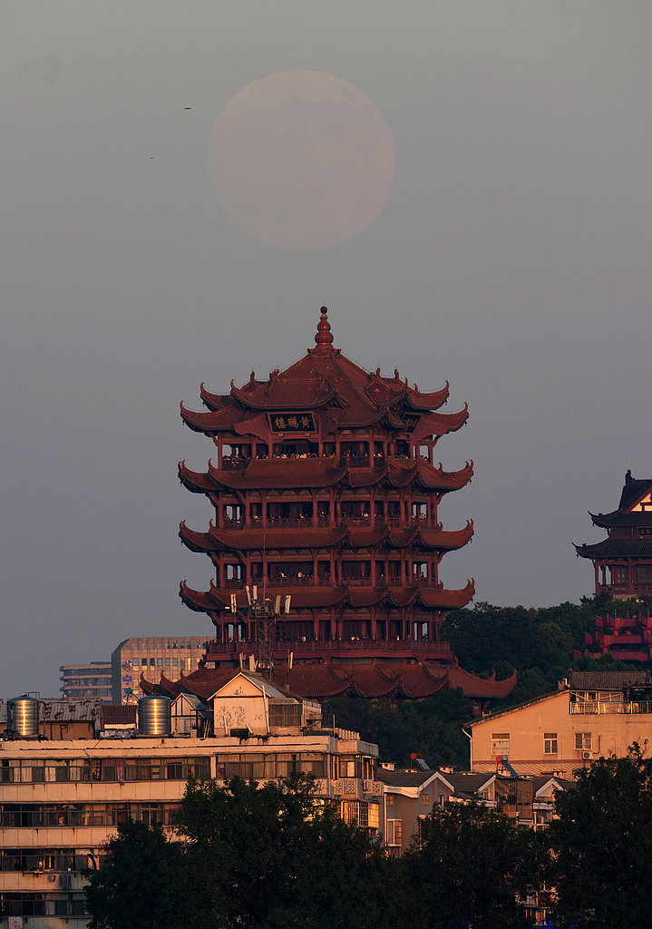 中秋佳節(jié),一輪明月從夕陽(yáng)和薄霧下的武漢黃鶴樓上緩緩升起,吸引了眾多市民前來(lái)觀看。