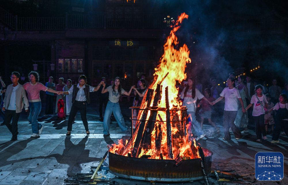 ↑ 10月5日晚,在貴州省晴隆縣阿妹戚托小鎮(zhèn),游客與當(dāng)?shù)厝罕妵艋鸸参琛P氯A社記者 楊文斌 攝