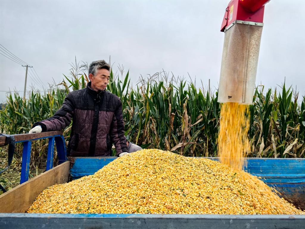 在菏澤市曹縣蘇集鎮(zhèn)一處農田旁,收獲的玉米正在裝車。新華社記者葉婧 攝