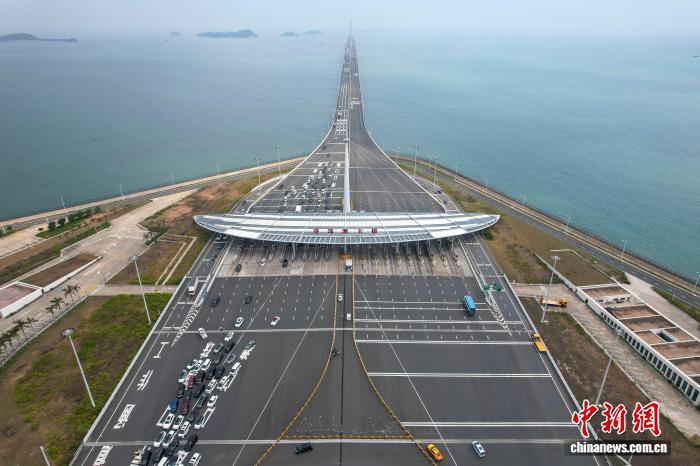 2024年3月30日,廣東珠海,港澳車輛經(jīng)港珠澳大橋珠海公路口岸入境。(無人機照片) 中新社記者 陳驥旻 攝