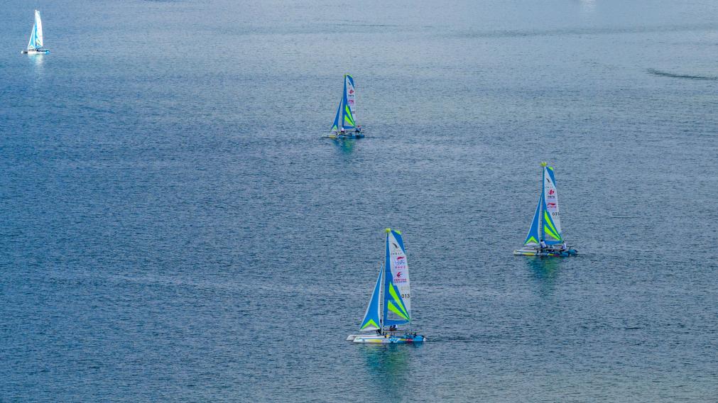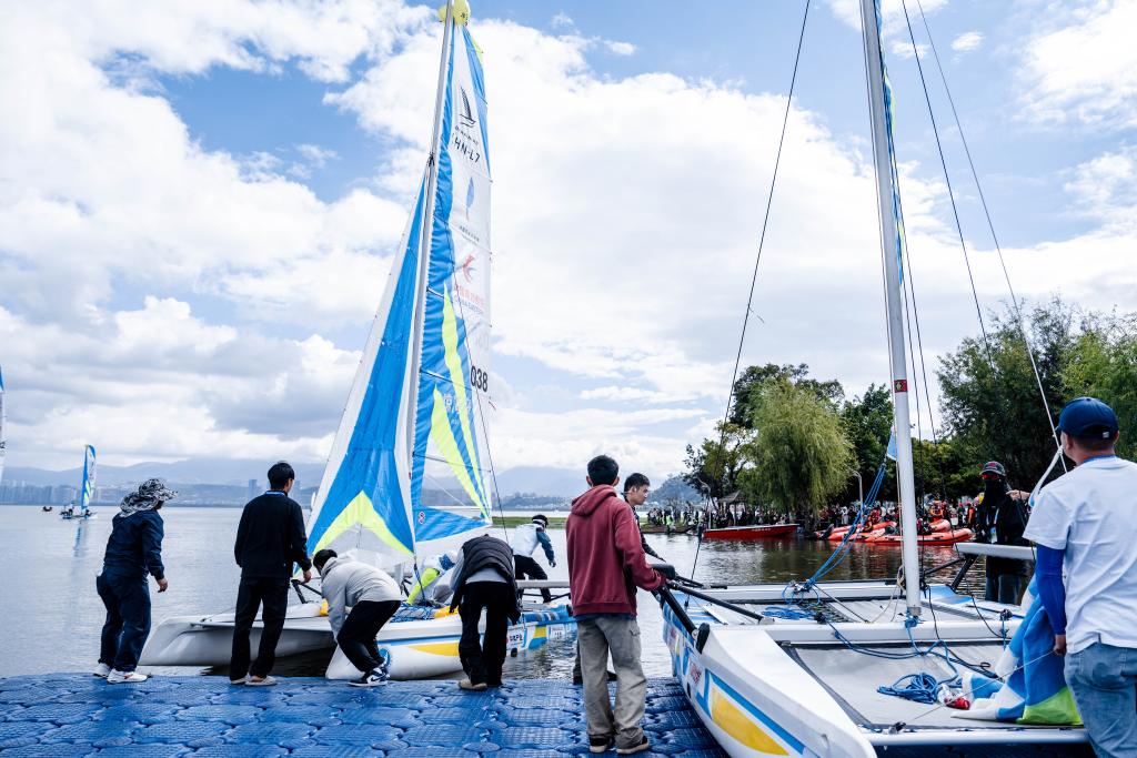 10月25日,中國萬水千帆賽大理站在云南省大理白族自治州開賽,圖為參賽船只從出發(fā)點(diǎn)下水。新華社記者 胡超 攝