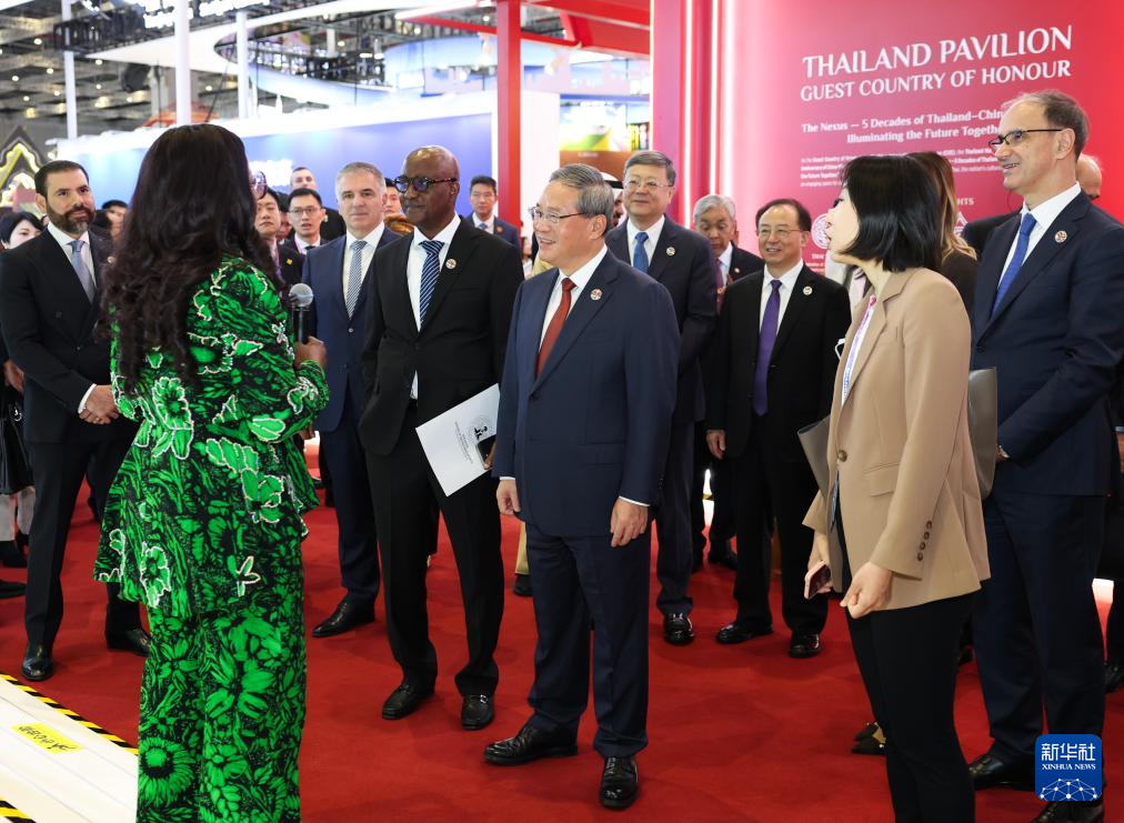 開幕式前,李強參觀了企業(yè)展。開幕式后,李強同與會外國領(lǐng)導人共同巡館。