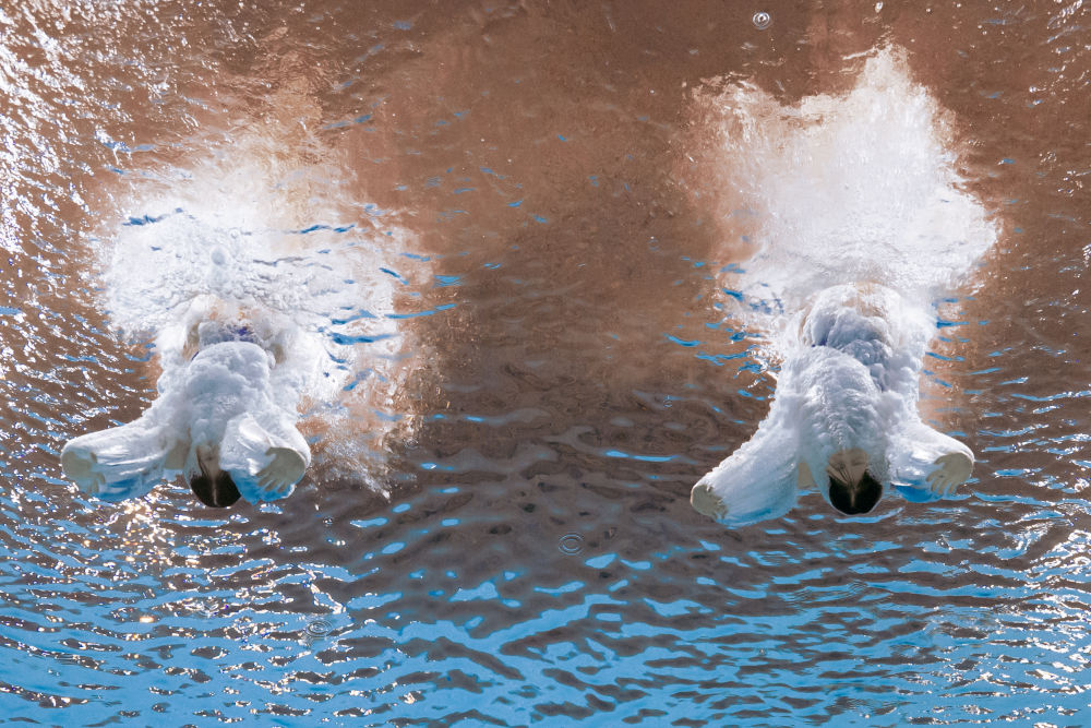 11月2日,廣東隊(duì)組合全紅嬋/王偉瑩在跳水女子團(tuán)體賽雙人10米跳臺(tái)項(xiàng)目比賽中。新華社記者 夏一方 攝