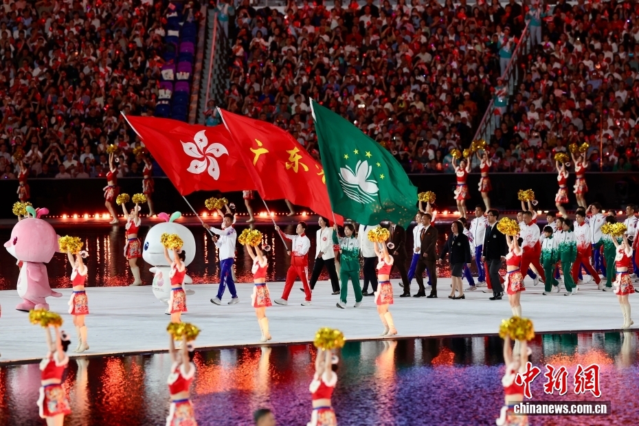 11月9日晚,第十五屆全國(guó)運(yùn)動(dòng)會(huì)開(kāi)幕式在廣東奧林匹克體育中心舉行。圖為東道主廣東、香港、澳門(mén)體育代表團(tuán)同時(shí)入場(chǎng)。中新社記者 富田 攝